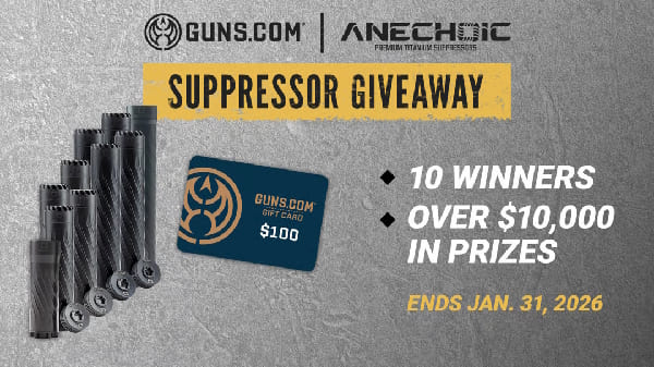 Enter to win a Anechoic Suppressor + $100 Guns.com Gift Card Giveaway (10 Winners), valued at $1,500. Ends 1/31/26.