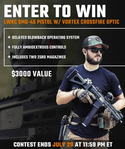 Enter to win a LWRC SMG-45 Pistol + Vortex Crossfire Red Dot Giveaway, valued at $3,000. Ends 7/29/20.