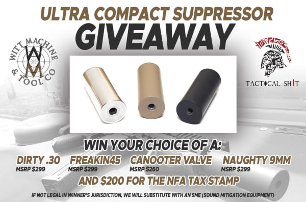 Enter to win a Witt Machine Ultra Compact Suppressor + Tax Stamp Giveaway, valued at $499. Ends 7/31/20.