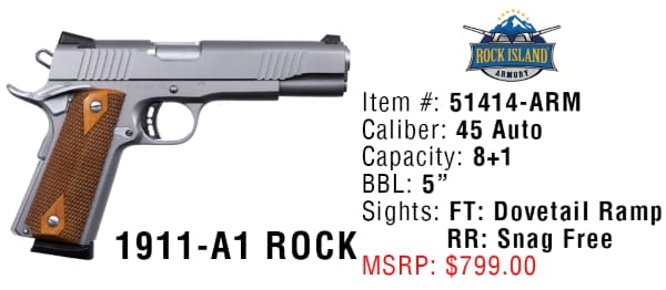 Enter to win a Rock Island M1911-A1 Pistol Giveaway, valued at $799. Ends 2/22/20.