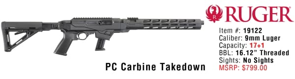 Enter to win a Ruger PC Carbine Takedown Rifle Giveaway, valued at $799. Ends 11/30/19.