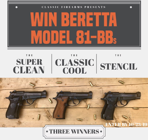 Enter to win a Beretta Model 81-BB Pistol Giveaway (3 Winners), valued at $230. Ends 10/23/19.