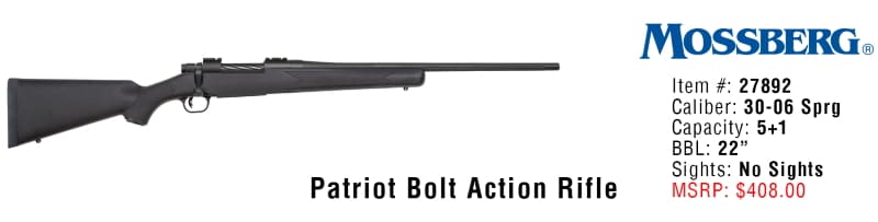 Enter to win a Mossberg Patriot .30-06 Rifle Giveaway, valued at $408. Ends 10/5/19.