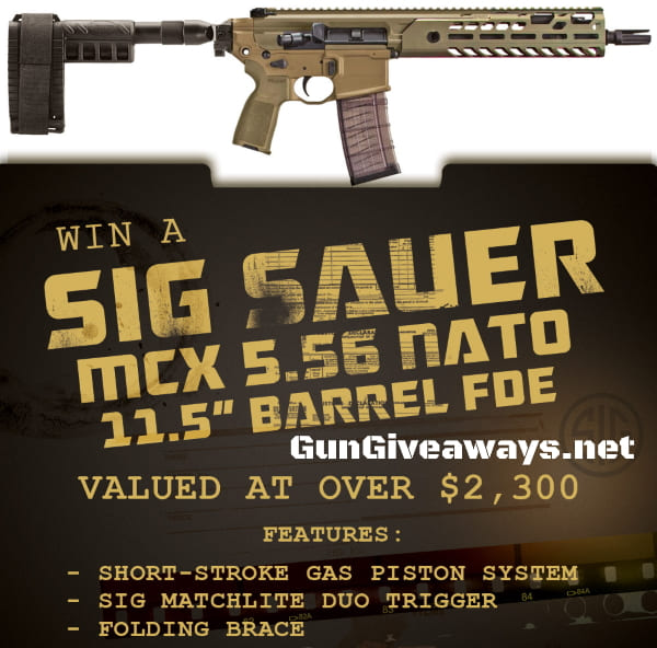 Enter to win a Sig Sauer MCX 5.56 FDE Pistol Giveaway, valued at $2,300. Ends 9/23/19.