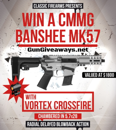 Enter to win a CMMG Banshee Mk57 Pistol Giveaway, valued at $1,800. Ends 8/5/19.