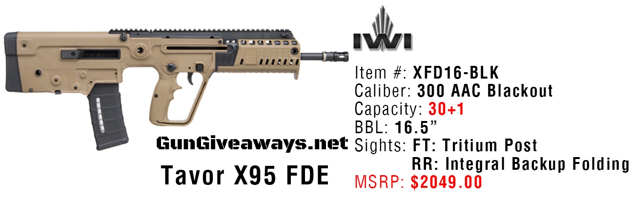 Enter to win an IWI Tavor X95 FDE .300BLK Rifle Giveaway, valued at $2,049. Ends 7/20/19.