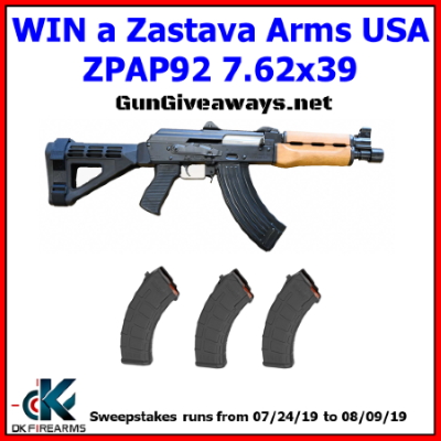 Enter to win a Zastava Arms USA ZPAP92 7.62×39 Pistol Giveaway, valued at $961. Ends 8/9/19.
