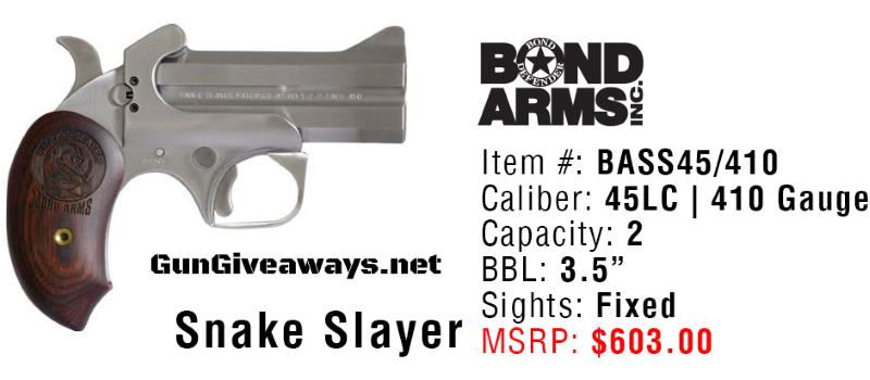 Enter to win a Bond Arms Snake Slayer .410 Derringer Giveaway, valued at $603. Ends 3/16/19.